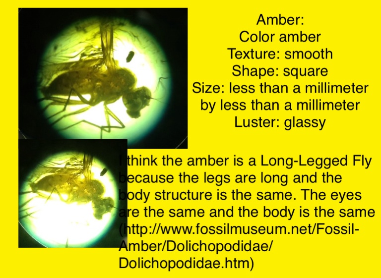 I think the amber is a Long-Legged Fly because the legs are long and the body structure is the same. The eyes are the same and the body is the same