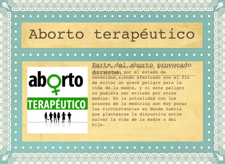 Abarca el aborto médico, científico, justificado por el estado de necesidad,siendo efectuado con el fin de evitar un grave peligro para la vida de la madre, y si este peligro no pudiera ser evitado por otros medios. En la actualidad con los avances de la medicina son muy pocas las circunstancias en donde habría que plantearse la disyuntiva entre salvar la vida de la madre o del hijo.