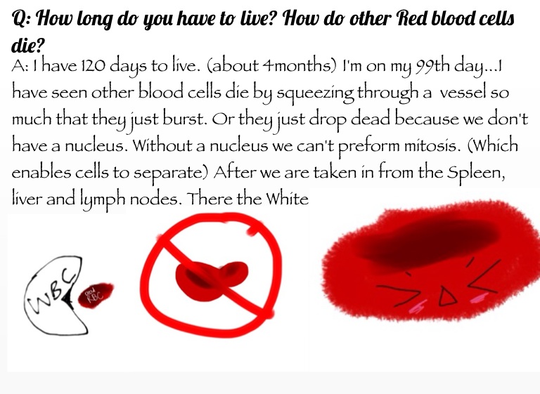 A: I have 120 days to live. (about 4months) I'm on my 99th day...I have seen other blood cells die by squeezing through a vessel so much that they just burst. Or they just drop dead because we don't have a nucleus. Without a nucleus we can't preform mitosis. (Which enables cells to separate) After we are taken in from the Spleen, liver and lymph nodes. There the White blood cells digest us.