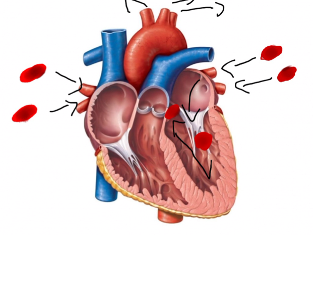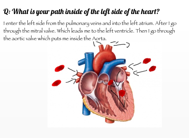 I enter the left side from the pulmonary veins and into the left atrium. After I go through the mitral valve. Which leads me to the left ventricle. Then I go through the aortic valve which puts me inside the Aorta.