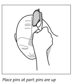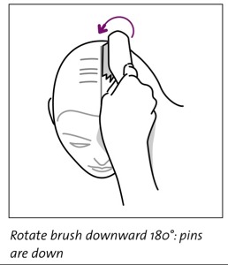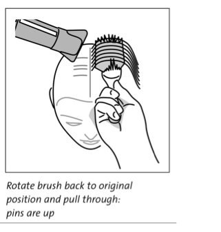 - using THE WRIST only, rotate brush 180° until pins on opposite side of the brush are at the part