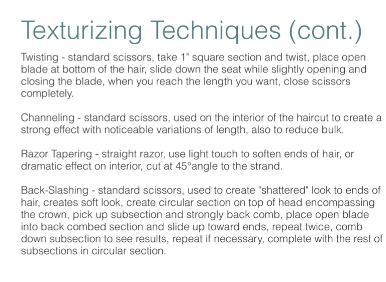 Back-Slashing - standard scissors, used to create "shattered" look to ends of hair, creates soft look, create circular section on top of head encompassing the crown, pick up subsection and strongly back comb, place open blade into back combed section and slide up toward ends, repeat twice, comb down subsection to see results, repeat if necessary, complete with the rest of subsections in circular section.
