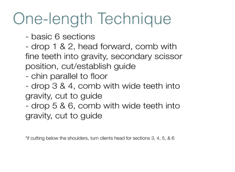 - drop 1 & 2, head forward, comb with fine teeth into gravity, secondary scissor position, cut/establish guide