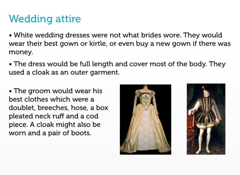 • White wedding dresses were not what brides wore. They would wear their best gown or kirtle, or even buy a new gown if there was money.