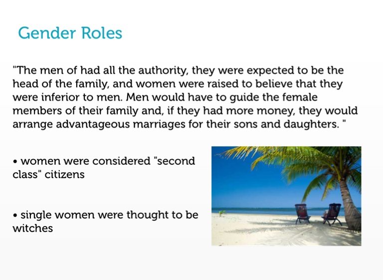 "The men of had all the authority, they were expected to be the head of the family, and women were raised to believe that they were inferior to men. Men would have to guide the female members of their family and, if they had more money, they would arrange advantageous marriages for their sons and daughters. "