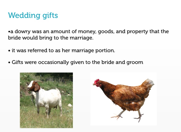 •a dowry was an amount of money, goods, and property that the bride would bring to the marriage.