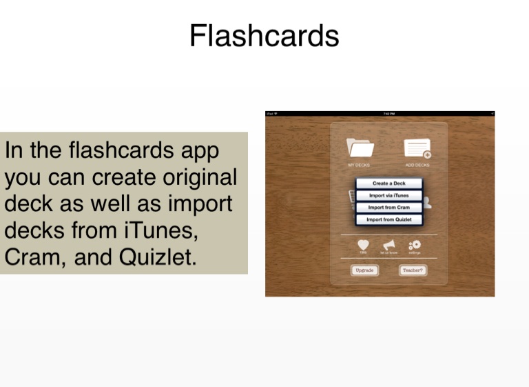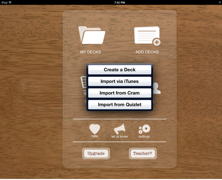 In the flashcards app you can create original deck as well as import decks from iTunes, Cram, and Quizlet.