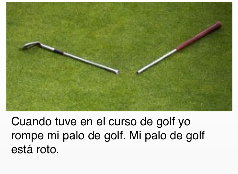 Cuando tuve en el curso de golf yo rompe mi palo de golf. Mi palo de golf está roto.
