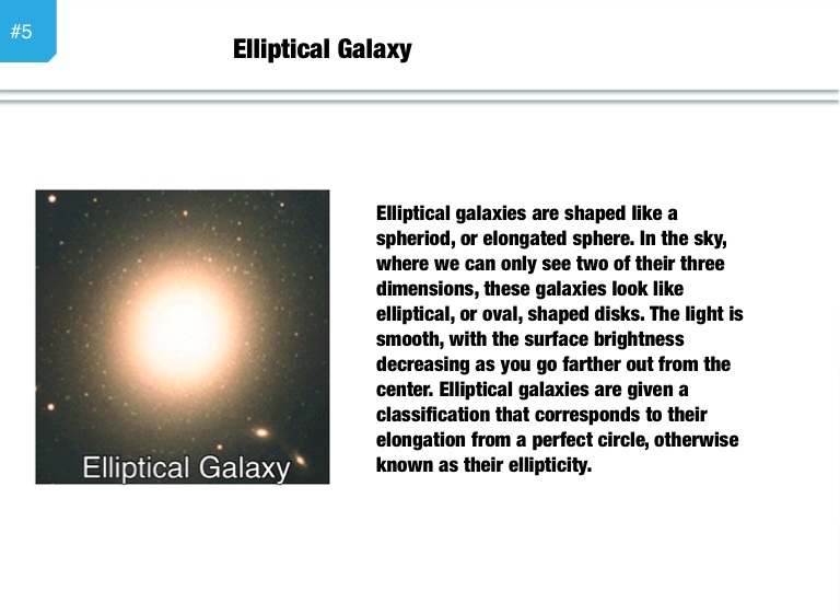 Elliptical galaxies are shaped like a spheriod, or elongated sphere. In the sky, where we can only see two of their three dimensions, these galaxies look like elliptical, or oval, shaped disks. The light is smooth, with the surface brightness decreasing as you go farther out from the center. Elliptical galaxies are given a classification that corresponds to their elongation from a perfect circle, otherwise known as their ellipticity.