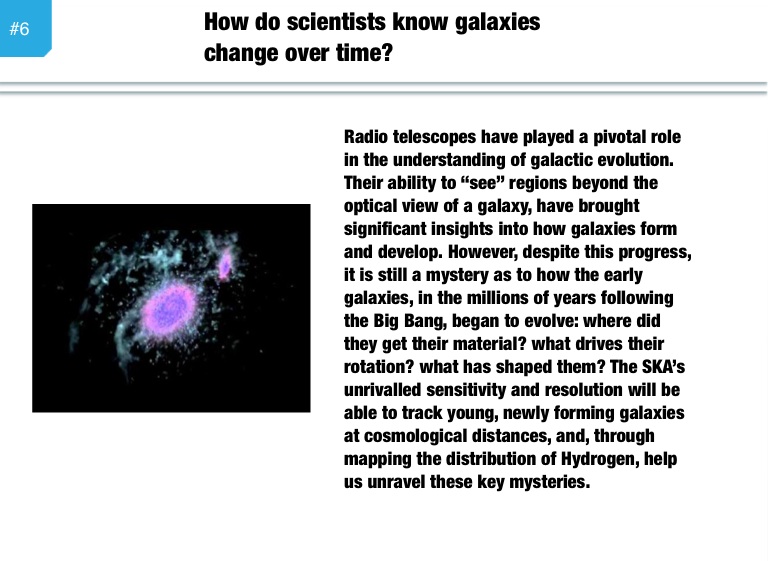 Radio telescopes have played a pivotal role in the understanding of galactic evolution. Their ability to “see” regions beyond the optical view of a galaxy, have brought significant insights into how galaxies form and develop. However, despite this progress, it is still a mystery as to how the early galaxies, in the millions of years following the Big Bang, began to evolve: where did they get their material? what drives their rotation? what has shaped them? The SKA’s unrivalled sensitivity and resolution will be able to track young, newly forming galaxies at cosmological distances, and, through mapping the distribution of Hydrogen, help us unravel these key mysteries.