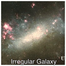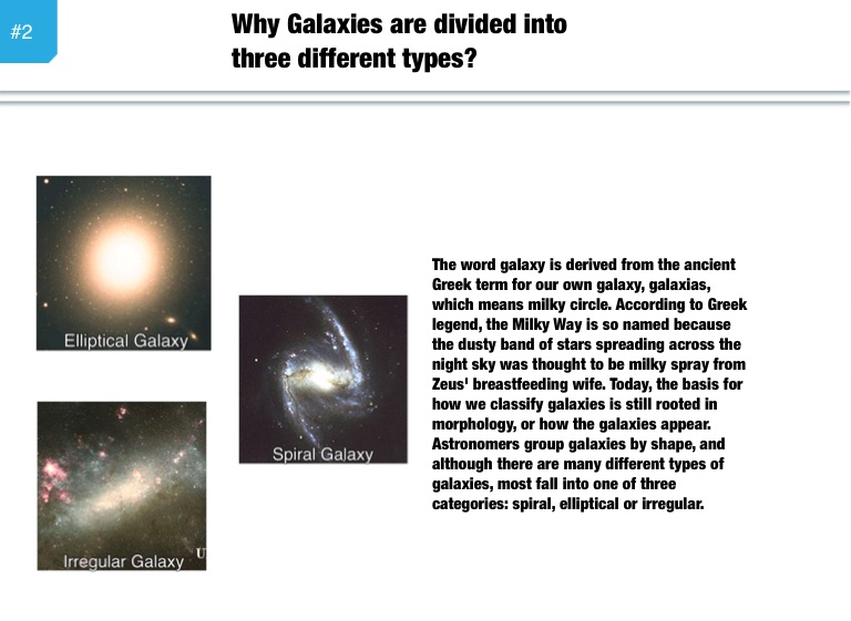 The word galaxy is derived from the ancient Greek term for our own galaxy, galaxias, which means milky circle. According to Greek legend, the Milky Way is so named because the dusty band of stars spreading across the night sky was thought to be milky spray from Zeus' breastfeeding wife. Today, the basis for how we classify galaxies is still rooted in morphology, or how the galaxies appear. Astronomers group galaxies by shape, and although there are many different types of galaxies, most fall into one of three categories: spiral, elliptical or irregular.