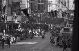Large crowds line Main Street in downtown Dallas near the Adolphus Hotel.