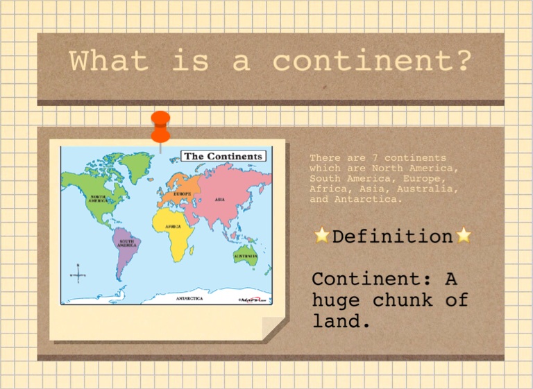 Continent: A huge chunk of land.