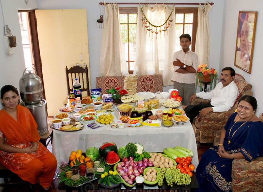 La famille Patkar: Jayant, 48 ans, Sangeeta 42 ans, leur fille Neha 19 ans et leurs fils Akshay, 15 ans, dans leur salle à manger à Ujjain, Madhya Pradesh, en Inde. Leur budget alimentaire mensuel s'élève à 30€ (valeur 2005)