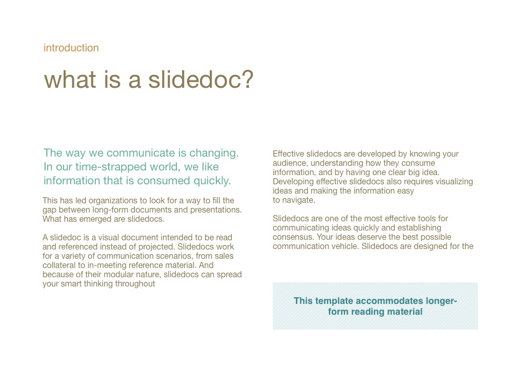 A slidedoc is a visual document intended to be read and referenced instead of projected. Slidedocs work for a variety of communication scenarios, from sales collateral to in-meeting reference material. And because of their modular nature, slidedocs can spread your smart thinking throughout