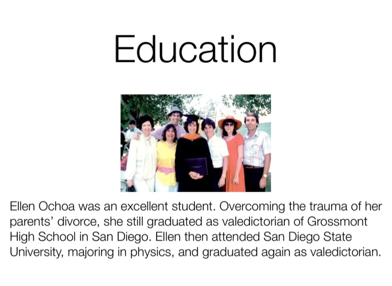 Ellen Ochoa was an excellent student. Overcoming the trauma of her parents’ divorce, she still graduated as valedictorian of Grossmont High School in San Diego. Ellen then attended San Diego State University, majoring in physics, and graduated again as valedictorian.