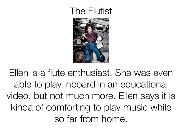 Ellen is a flute enthusiast. She was even able to play inboard in an educational video, but not much more. Ellen says it is kinda of comforting to play music while so far from home.