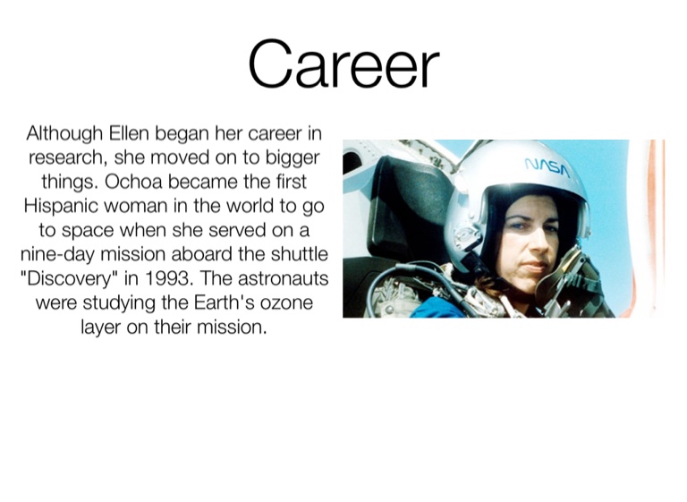 Although Ellen began her career in research, she moved on to bigger things. Ochoa became the first Hispanic woman in the world to go to space when she served on a nine-day mission aboard the shuttle "Discovery" in 1993. The astronauts were studying the Earth's ozone layer on their mission.