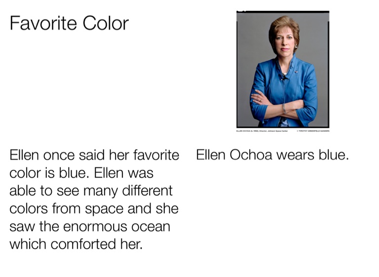Ellen once said her favorite color is blue. Ellen was able to see many different colors from space and she saw the enormous ocean which comforted her.