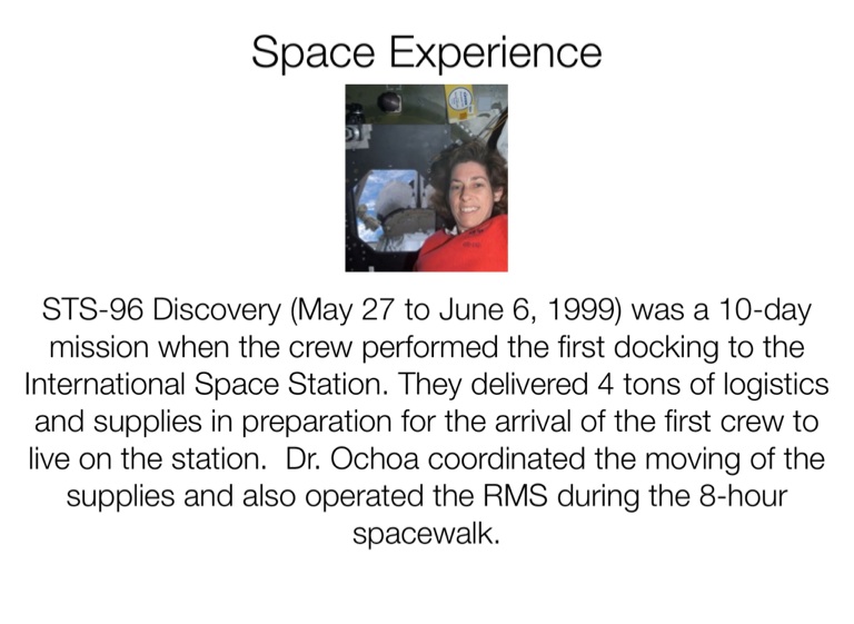 STS-96 Discovery (May 27 to June 6, 1999) was a 10-day mission when the crew performed the first docking to the International Space Station. They delivered 4 tons of logistics and supplies in preparation for the arrival of the first crew to live on the station. Dr. Ochoa coordinated the moving of the supplies and also operated the RMS during the 8-hour spacewalk.