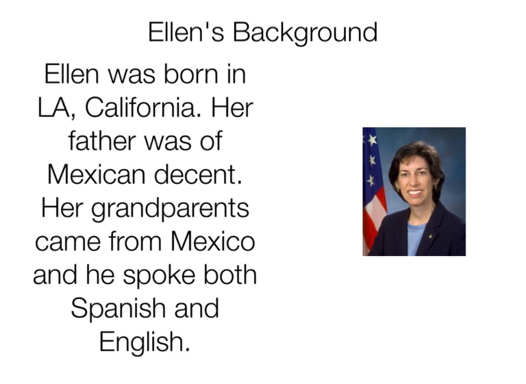 Ellen was born in LA, California. Her father was of Mexican decent. Her grandparents came from Mexico and he spoke both Spanish and English.