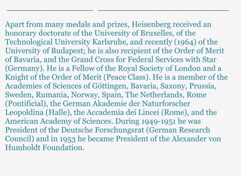 Apart from many medals and prizes, Heisenberg received an honorary doctorate of the University of Bruxelles, of the Technological University Karlsruhe, and recently (1964) of the University of Budapest; he is also recipient of the Order of Merit of Bavaria, and the Grand Cross for Federal Services with Star (Germany). He is a Fellow of the Royal Society of London and a Knight of the Order of Merit (Peace Class). He is a member of the Academies of Sciences of Göttingen, Bavaria, Saxony, Prussia, Sweden, Rumania, Norway, Spain, The Netherlands, Rome (Pontificial), the German Akademie der Naturforscher Leopoldina (Halle), the Accademia dei Lincei (Rome), and the American Academy of Sciences. During 1949-1951 he was President of the Deutsche Forschungsrat (German Research Council) and in 1953 he became President of the Alexander von Humboldt Foundation.