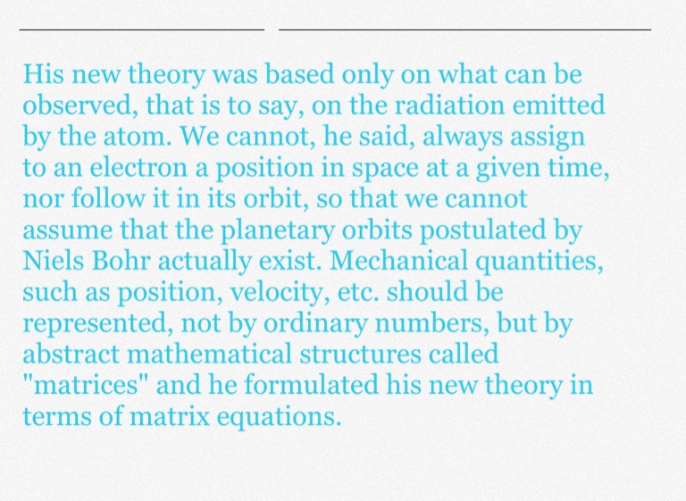 His new theory was based only on what can be observed, that is to say, on the radiation emitted by the atom. We cannot, he said, always assign to an electron a position in space at a given time, nor follow it in its orbit, so that we cannot assume that the planetary orbits postulated by Niels Bohr actually exist. Mechanical quantities, such as position, velocity, etc. should be represented, not by ordinary numbers, but by abstract mathematical structures called "matrices" and he formulated his new theory in terms of matrix equations.