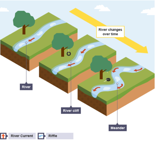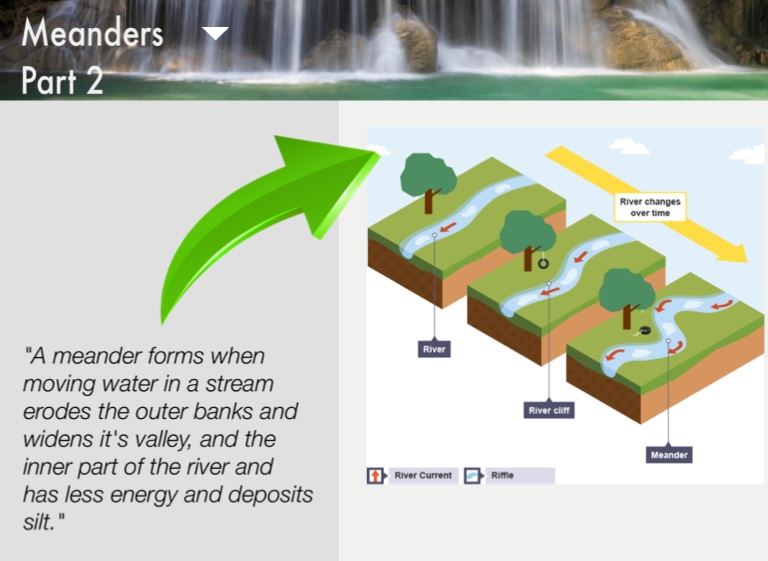 "A meander forms when moving water in a stream erodes the outer banks and widens it's valley, and the inner part of the river and has less energy and deposits silt."