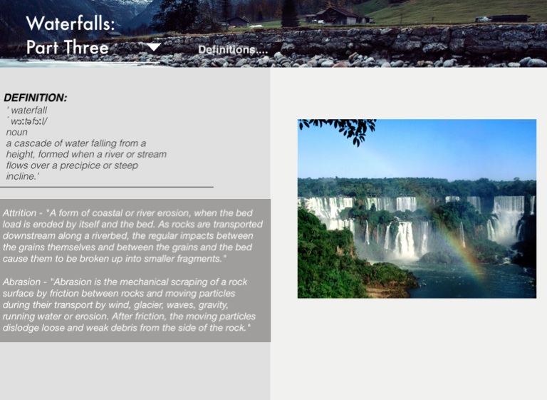 a cascade of water falling from a height, formed when a river or stream flows over a precipice or steep incline.'