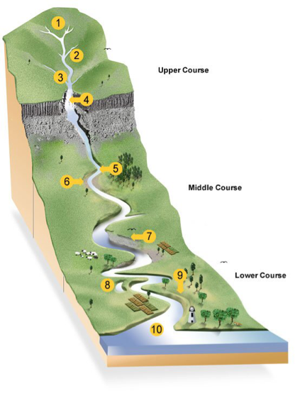 1. Source 2.Tributaries 3. Interlocking spurs 4. Waterfall 5. Meander 6. Lateral Erosion 7. Levée 8. Ox-bow Lake 9. Deposition 10. Mouth