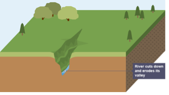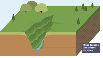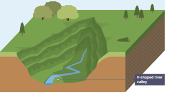 V-shaped valleys are formed when a river cuts down into its valley, and widens and deepens. This is due to hydraulic action and corrosion and corrasion. Corrasion often occurs during floods, when the river is able to transport most of its load along its base, which rub it away.