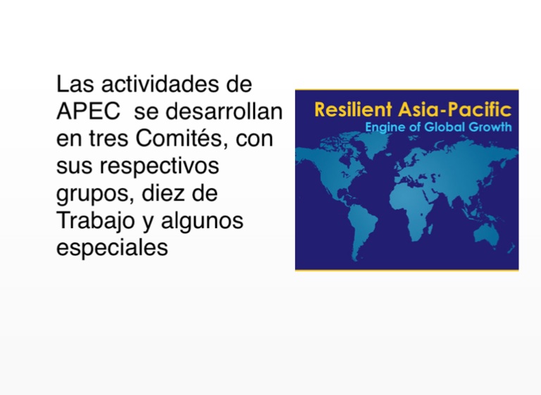 Las actividades de APEC se desarrollan en tres Comités, con sus respectivos grupos, diez de Trabajo y algunos especiales