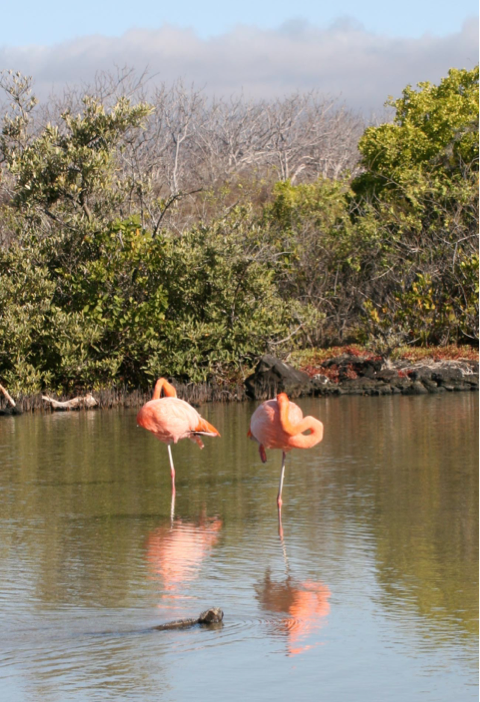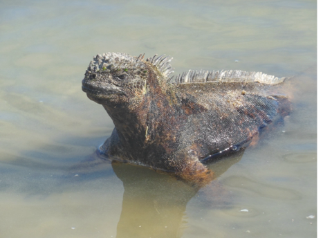 Marine iguana poses in brackish pond, then swims in front of flamingos.