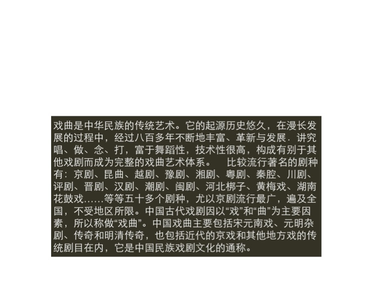 戏曲是中华民族的传统艺术。它的起源历史悠久,在漫长发展的过程中,经过八百多年不断地丰富、革新与发展.讲究唱、做、念、打,富于舞蹈性,技术性很高,构成有别于其他戏剧而成为完整的戏曲艺术体系。
