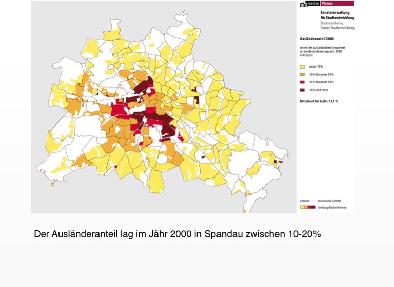 Der Ausländeranteil lag im Jähr 2000 in Spandau zwischen 10-20%