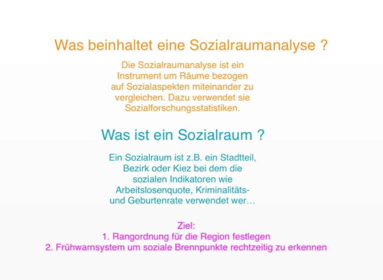 Ein Sozialraum ist z.B. ein Stadtteil, Bezirk oder Kiez bei dem die sozialen Indikatoren wie Arbeitslosenquote, Kriminalitäts- und Geburtenrate verwendet werden