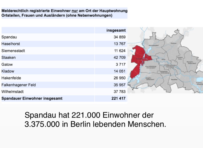 Spandau hat 221.000 Einwohner der 3.375.000 in Berlin lebenden Menschen.