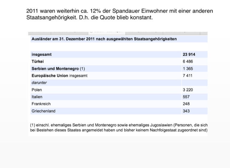 2011 waren weiterhin ca. 12% der Spandauer Einwohner mit einer anderen Staatsangehörigkeit. D.h. die Quote blieb konstant.