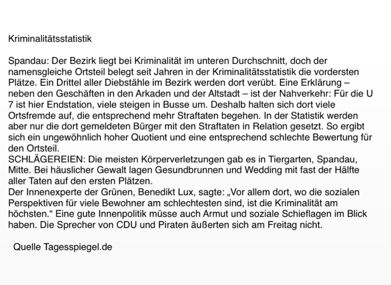 Spandau: Der Bezirk liegt bei Kriminalität im unteren Durchschnitt, doch der namensgleiche Ortsteil belegt seit Jahren in der Kriminalitätsstatistik die vordersten Plätze. Ein Drittel aller Diebstähle im Bezirk werden dort verübt. Eine Erklärung – neben den Geschäften in den Arkaden und der Altstadt – ist der Nahverkehr: Für die U 7 ist hier Endstation, viele steigen in Busse um. Deshalb halten sich dort viele Ortsfremde auf, die entsprechend mehr Straftaten begehen. In der Statistik werden aber nur die dort gemeldeten Bürger mit den Straftaten in Relation gesetzt. So ergibt sich ein ungewöhnlich hoher Quotient und eine entsprechend schlechte Bewertung für den Ortsteil.
