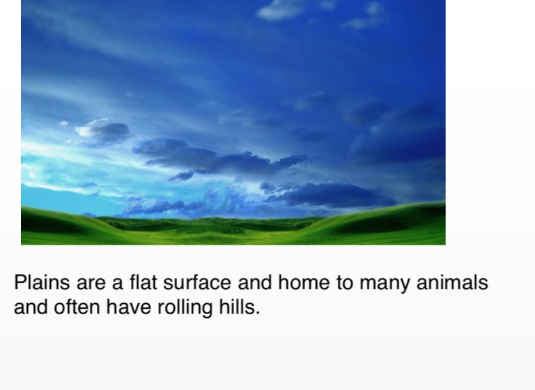 Plains are a flat surface and home to many animals and often have rolling hills.
