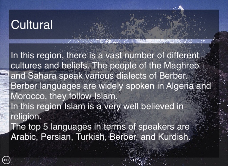 In this region, there is a vast number of different cultures and beliefs. The people of the Maghreb and Sahara speak various dialects of Berber.