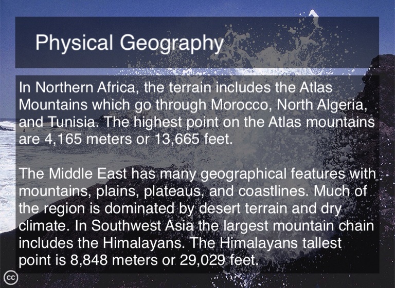 The Middle East has many geographical features with mountains, plains, plateaus, and coastlines. Much of the region is dominated by desert terrain and dry climate. In Southwest Asia the largest mountain chain includes the Himalayans. The Himalayans tallest point is 8,848 meters or 29,029 feet.