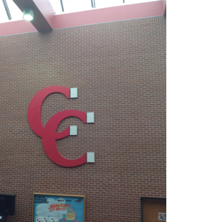 The focal point is the big C's on the wall as soon as you walk up the first set of stairs. They are big and bright because they are important to our school. They are hard to miss which is the main idea when having a focal point.