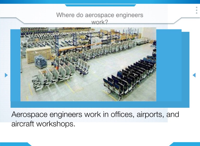 Aerospace engineers work in offices, airports, and aircraft workshops.