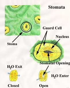Stomata is a pore that is found in the epidermis of leaves used to to control gas exchange. Carbon Dioxide is absorbed by the plant through the stomata.