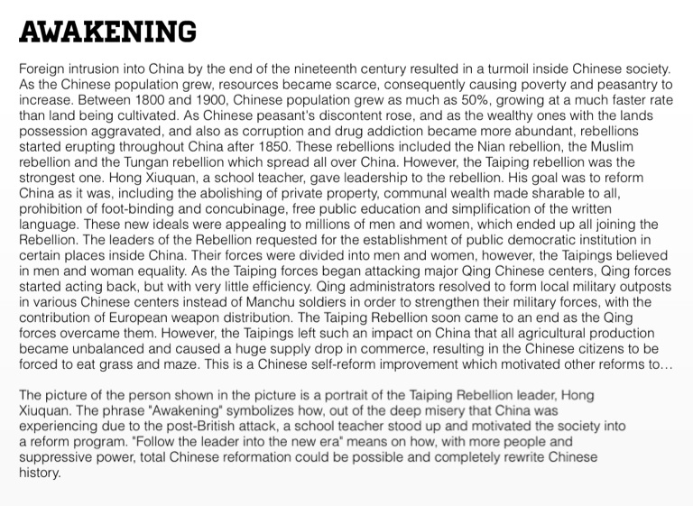 The picture of the person shown in the picture is a portrait of the Taiping Rebellion leader, Hong Xiuquan. The phrase "Awakening" symbolizes how, out of the deep misery that China was experiencing due to the post-British attack, a school teacher stood up and motivated the society into a reform program. "Follow the leader into the new era" means on how, with more people and suppressive power, total Chinese reformation could be possible and completely rewrite Chinese history.