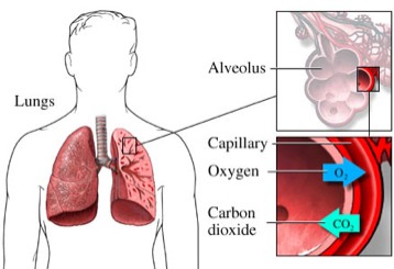 Oxygen and carbon dioxide are exchanged in the alveoli in the bronchial tubes. When you breathe in, oxygen moves from the alveoli to the capillaries and into the bloodstream. While that happens, carbon dioxide moves from the bloodstream to the capillaries and into the alveoli, releasing the carbon dioxide.
