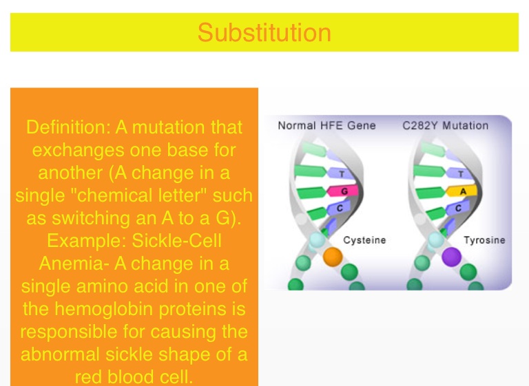 Definition: A mutation that exchanges one base for another (A change in a single "chemical letter" such as switching an A to a G).