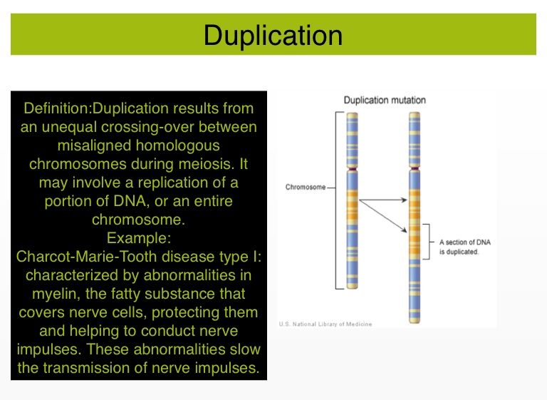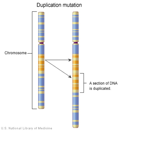 Definition:Duplication results from an unequal crossing-over between misaligned homologous chromosomes during meiosis. It may involve a replication of a portion of DNA, or an entire chromosome.