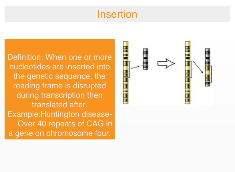 Definition: When one or more nucleotides are inserted into the genetic sequence, the reading frame is disrupted during transcription then translated after.